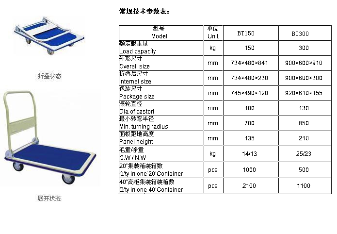 ※ 冲压板材型,手柄可折叠,面铺防滑橡胶皮,常规为白色喷塑面漆,脚轮可配橡胶轮或PU轮,常规为两定向两万向脚轮。 ※ 本品适用于超市、卖场、医院、仓库、物流中心等场所。因该品把手部位可以放倒,轿车坐椅、后备箱都可以摆放,方便 随车携带,使用时灵活方便,平时不占地方,是你搬运,购物的好帮手。 ※ 出口采用单台或双台瓦楞纸箱包装。
